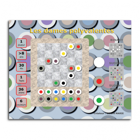 Les Dames de couleurs est un jeu de damier dont le but est de compléter des grilles initiales de Sudoku couleur, de Bynari ou de Sudoku-Bynari. Avec ses 24 grilles initiales pouvant être pivotées 4 fois, ce jeux fournira des heures de réflexion logique.