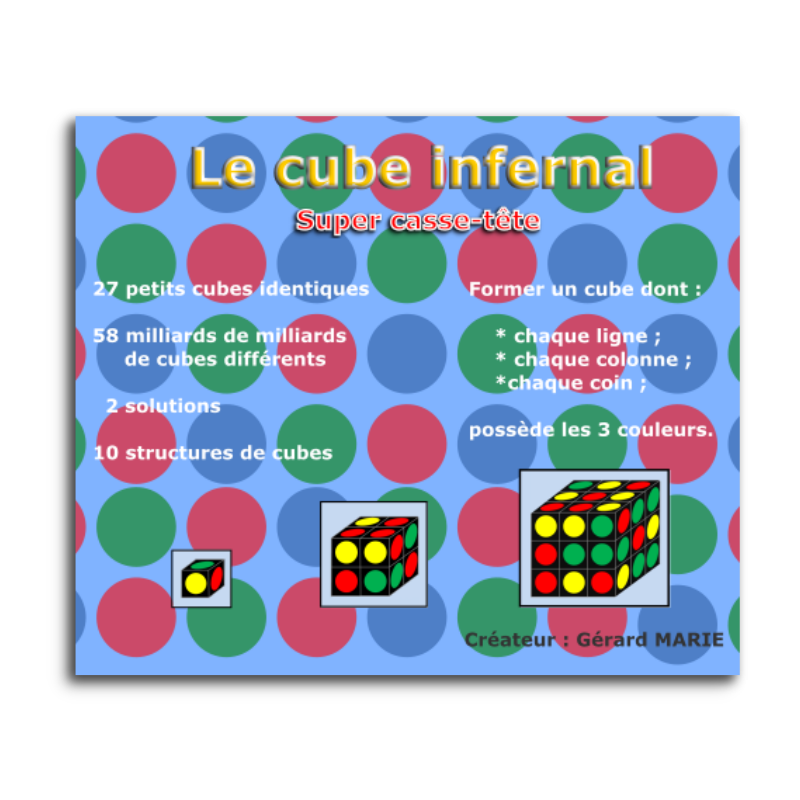 A partir des 27 petits cubes strictement identiques, vous devez constituer un cube dont chaque ligne, chaque colonne et chaque coin possèdes les 3 couleurs.