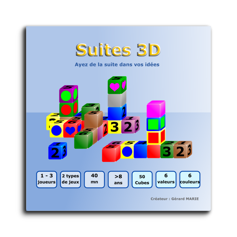 Suites 3D a pour but de marquer le plus de points possible en constituant des suites numériques, complètes ou partielles, croissantes ou décroissantes, horizontales ou verticales, uniques ou multiples, de cubes numériques de couleurs différentes aux propriétés spécifiques. Il existe 2 règles du jeu différentes : ludique (avec hasard) ou compétition (sans hasard) ;